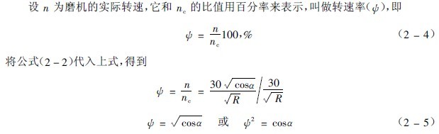 即角a標志鋼球開始拋落時已升到的位置,叫做脫離角。公式(2-5)指出,轉速率愈高,脫離角愈小,鋼球上升到的位置愈高。當脫離角為0。時,轉速率為1,即實際轉速已等于臨界轉速,鋼球到了磨機的頂點,要開始離心化了。