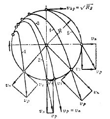 當鋼球以速度vp到達落回點時,它的動能分解為兩部分:一部分沿打擊線OB(通過物體的打擊接觸點,并垂直于接觸面的直線)沖擊礦石;另一部分與打擊線垂直,使鋼球沿切線方向運動,這部分使礦石受磨剝而沒有沖擊作用。如果把vp分解為沿打擊線的徑向分速度vn和沿切向分速度v1,求出這兩個分速度,就可以知道沖擊礦石的能量和磨剝礦石的能量各占若干。