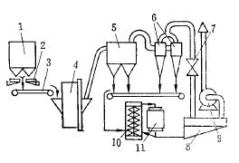 被粉碎的物料在主風機10(主風機的作用是使調節好的空氣流在自磨機和分級機內循環并運輸物料)造成的強大風力作用下被連續排出,沿著管道進入沉降箱6進行第一次分級,較粗的顆粒便沉降下來。細小的物料繼續進入旋風分離器7,進行第二次分級,這時絕大部分細小物料都沉降。已在沉降箱和旋風分離器中沉降的物料靠鎖氣器8間斷排出,貯存在粉礦倉9中,以便進行干式磁選。