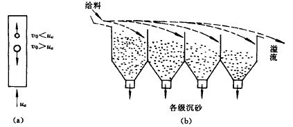 分級過程的示意圖見圖1(a),沉降末速大于上升介質流速的礦粒下沉到分級設備的底部,作為沉砂或底流排出;沉降末速小于上升介質流速的細粒級產物從上端溢出,成為溢流。如果要得到多個粒級產物,則可將溢流(或沉砂)在依次減小(或增大)的上升水流中繼續進行分級。