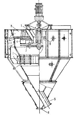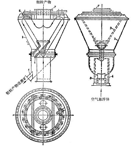 通過式離心分級(jí)器(見圖3),主要用于與干式磨機(jī)閉路工作。設(shè)備主要由外錐1和內(nèi)錐2組成,上部裝有導(dǎo)向葉片5,使由內(nèi)外錐之間上來的氣流呈切線進(jìn)入內(nèi)錐。磨機(jī)產(chǎn)物與氣流一起從底部管道中以大約18~20米/秒的速度向上供入,進(jìn)入內(nèi)外錐之間的環(huán)形空間后,因過流斷面變大,速度降至4~6米/秒,于是,粗的礦粒落下,由管4中排出,返回磨機(jī)再磨。其他礦粒被氣流帶著往上行,經(jīng)葉片5,呈切線進(jìn)入內(nèi)錐,產(chǎn)生回旋運(yùn)動(dòng)。在慣性離心力作用下,較粗的礦粒被拋到內(nèi)錐壁上,然后下落,由排礦管6排出。這種產(chǎn)物或作為產(chǎn)品,或者返回磨機(jī),視情況而定。細(xì)礦粒隨氣流從頂部管道中排出,至集塵器中收集,為細(xì)粒產(chǎn)物。