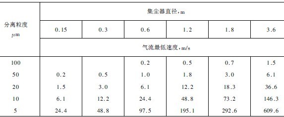表1旋風(fēng)集塵器氣流入口速度與分離粒度的關(guān)系