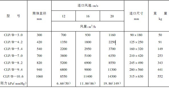 表2 CLP/B型旋風(fēng)集塵器技術(shù)規(guī)格(一)