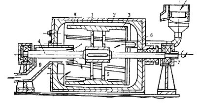 圖2為原蘇聯研制的臥式離心磨機,其結構如下:1為固定不動的筒體,其內表面敷設形如兩個截圓錐組成的錳鋼襯板2。3為帶輪翅的轉子。轉子3經過輪殼5固定在轉軸4上。輪殼5上設有孔6,以便研磨介質和礦漿7的循環。旋轉轉子安裝在軸承8中。給料量由轉子3與襯板間的間隙9的大小來調節。磨礦產品經排料管10排出。帶輪翅的轉子3旋轉時產生離心力,在此離心力作用下給入到磨機的礦漿也產生旋轉,由此而產生較大的礦漿壓力。物料在沖擊和磨剝作用下被粉碎。轉子的速度達每秒12米,這樣可保證被磨物料能很好分級,從而大大減少礦泥的形成。該離心磨機在巴拉哈什選礦廠進行了工業試驗。
