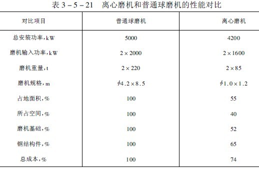 德國魯奇公司在南非礦山,對離心磨礦機和常規球磨機的設備性能作了詳細的經濟對比,結果如下:某礦山的鐵礦石磨碎到要求的磨礦產品細度,每種磨機產量為每年2000萬噸,給礦粒度為6毫米,磨礦產品細度的比表面積為1700~1800厘米2/克,采用水力旋流器進行濕式閉路磨礦等相同條件下,選用一臺4.2×8.5米常規管磨機和1.0×1.2米離心磨礦機進行試驗比較,對比結果如表3-5-21所示。由表可知,離心磨礦機組的總成本為球磨機組的74%。