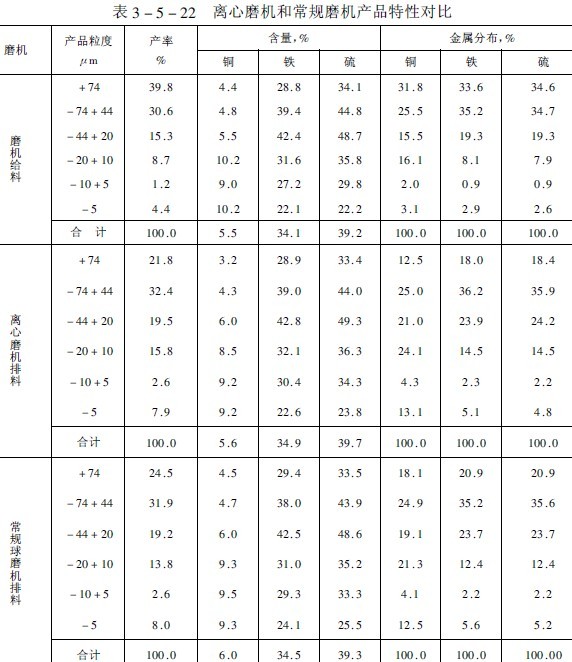 表3-5-21的所示的結果表明,兩種磨機在單位能耗基本相同的條件下,磨礦產品的粒度組成和比表面積,以及研磨介質工作表面的磨耗大致相同。由此可見,采用離心磨礦機代替常規球磨機,對選別作業的工藝制度并無影響。