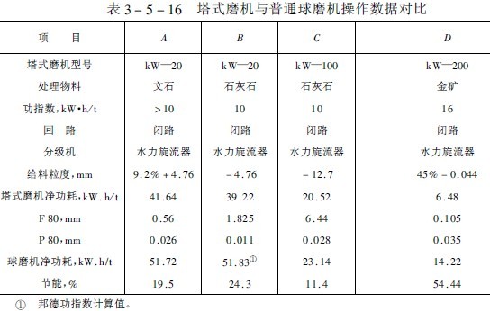 表3-5-16示出了美國科珀(Kopper)公司的某一子公司提供的塔式磨機(jī)與球磨機(jī)的工作性能對(duì)比結(jié)果,表中,例A、B是實(shí)驗(yàn)室試驗(yàn)結(jié)果;C是南方麥奇根煙氣脫硫系統(tǒng)磨機(jī)工作結(jié)果;D是裝在可蘭德湖拉卡礦業(yè)公司再磨回路中應(yīng)用情況,根據(jù)該公司的試驗(yàn)結(jié)果得出下述見解: