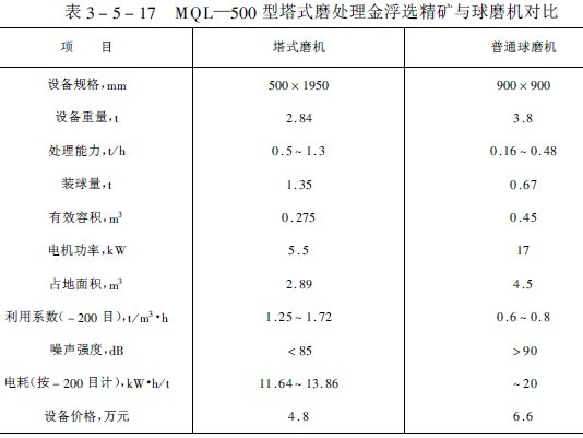 我國有關(guān)單位研制的MQL——500型螺旋攪拌塔式磨機(jī)也分干式、濕式兩種。濕式塔式磨機(jī)于1984年在大石河鐵礦選礦廠進(jìn)行過半工業(yè)試驗(yàn),后來在金廠裕金礦用作浮選金礦的再磨,以滿足該廠下步氰化浸出的要求。該廠采用一段塔式磨機(jī)可以將小于350目占64%的金浮選精礦磨細(xì)到小于350目占99.74%,磨機(jī)利用系數(shù)為0.485噸/米3時(shí),電能消耗為13.45千瓦/噸,鋼耗為4.65千克/噸,MQL——500型塔式磨機(jī)與球磨機(jī)工業(yè)試驗(yàn)指標(biāo)列于表3-5-17中。