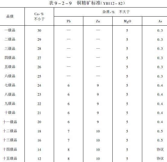 送往冶煉廠的銅精礦,由于礦石產(chǎn)地,礦石種類和銅選礦技術(shù)條件的不同,其化學成分和礦物組成是極其復雜的。冶煉廣對這些化學成分和礦物組成不作具體規(guī)定,僅根據(jù)冶煉方法,冶煉工藝特點及冶煉技術(shù)的不同,對某些成分加以適當限制。但出于冶煉對精料的要求,以及對選冶聯(lián)合成本的考慮,對入廠精礦的含銅品位規(guī)定了十五個等級(表9-2-9)。
