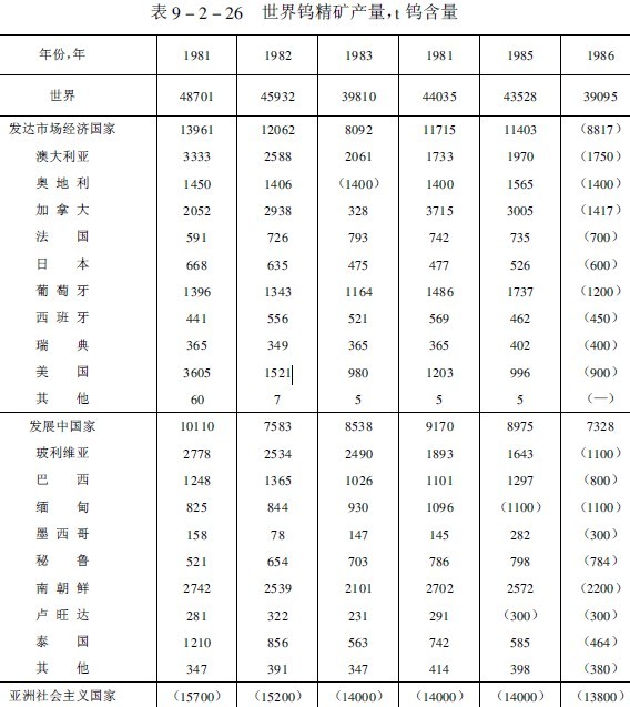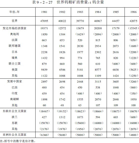 根據(jù)聯(lián)合國貿(mào)易和發(fā)展會議商品委員會鎢委會1986年11月第18屆會議報告資料,近幾年世界鎢精礦的產(chǎn)量和消費量分別列于表9-2-26及表9-2-27。