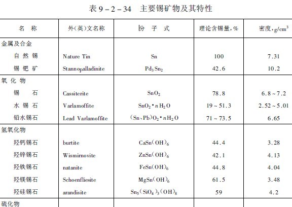 目前世界上已發現的錫礦物達60多種,包括氧化物、氫氧化物、硫化物、硫酸鹽、硅酸鹽、硼酸鹽、鉭鈮酸鹽以及天然金屬和合金。主要錫礦物及其特性列于表9-2-34。