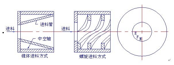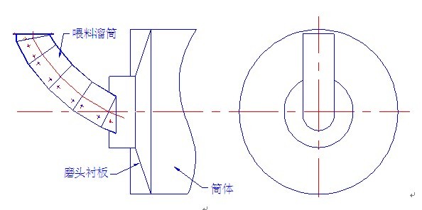 由于中空軸也隨著筒體一起運轉及物料和中空軸之間的摩擦力存在,故實際上這兩種進料方式的物料大都是從上圖↑中EFM處進入磨內的。滑履磨多采用進料溜筒直接進料如下圖↓,通常進料點多選擇在磨機進口的中心線靠下處。