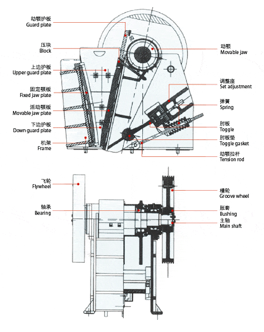 在顎式破碎機中,物料的破碎是在兩塊顎板之間進行的。可動顎板繞懸掛心軸對因定穎板作周期性擺動,當動顎靠近固定顎板時,則位于兩顎板間的礦石受壓碎、劈裂和彎曲作川而破碎。當動顎離開固定顎板時,已破碎的礦石在重力作用下,經排礦口排出到達下個工藝環節。