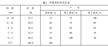 試驗(yàn)結(jié)果處理的基本內(nèi)容是計(jì)算產(chǎn)率。產(chǎn)率分為粒級產(chǎn)率與累積產(chǎn)率,粒級產(chǎn)率是該粒級的質(zhì)量占被篩物料總質(zhì)量的百分率,累積產(chǎn)率又分為篩上累積產(chǎn)率(又叫正累積)及篩下累積產(chǎn)率(又叫負(fù)累積)。正累積產(chǎn)率是大于某一篩孔的各粒級產(chǎn)率之和,負(fù)累積產(chǎn)率是小于某一篩孔的各粒級產(chǎn)率之和。在計(jì)算粒級產(chǎn)率時(shí),“被篩物料總質(zhì)量”可以用各粒級質(zhì)量之和,也可以用原試樣的質(zhì)量,此時(shí)把損失量加入較細(xì)級別,認(rèn)為篩分時(shí)呈灰塵飛揚(yáng)了。基本的篩分試驗(yàn)記錄及結(jié)果處理如表2所示。